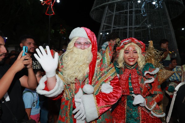 Entre o movimento da praça, o Papai Noel surgiu no meio do público e provocou a reação mais espontânea da noite. As crianças correram para vê-lo de perto, com os sorrisos que costumam marcar essa época do ano.
