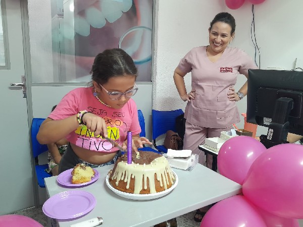 A odontopediatra, Mirella Esmeraldo, disse que ficou surpresa com o pedido. "Eu estava marcando a consulta dela para o início do mês, quando ela informou que queria esperar o dia 25, no aniversário, para comemorar conosco", explica. A equipe do CEO, prontamente organizou a festa, com balões rosa, bolo de chocolate e refrigerante, a pequena recebeu felicitações de todos no local.