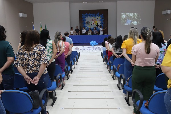 A Secretaria de Educação de Juazeiro do Norte promoveu nessa segunda-feira, 25, mais um encontro do Projeto permanente "Dialogando sobre a Inclusão". Com o tema: "Surdez: Perspectiva Clínica e Cultural", o momento foi aberto com a apresentação do hino do município, em Libras, feito pelos estudantes da Sala Educação Bilíngue de surdos, João Pedro Mota e Ana Laura Nascimento.