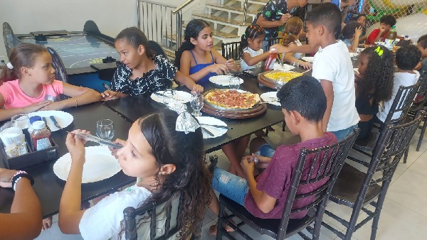 Além de experimentarem diversas opções de pizzas, as crianças também puderam aproveitar os jogos eletrônicos e manuais do espaço, bem como, outros brinquedos disponíveis na Pizzaria.