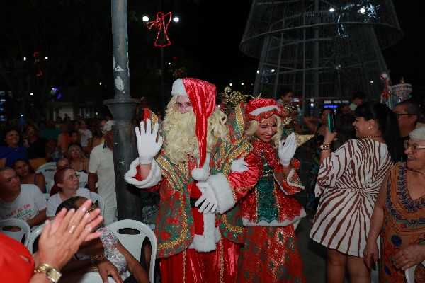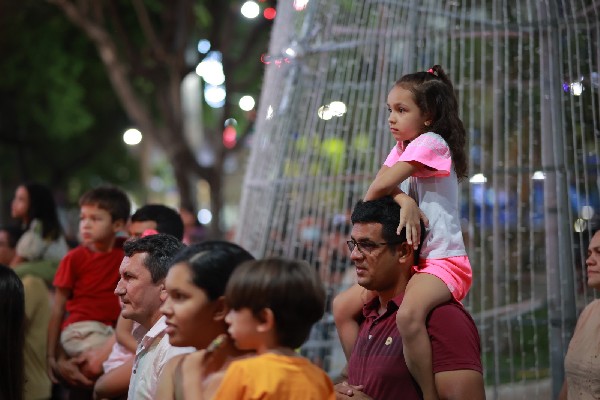 Entre o movimento da praça, o Papai Noel surgiu no meio do público e provocou a reação mais espontânea da noite. As crianças correram para vê-lo de perto, com os sorrisos que costumam marcar essa época do ano.